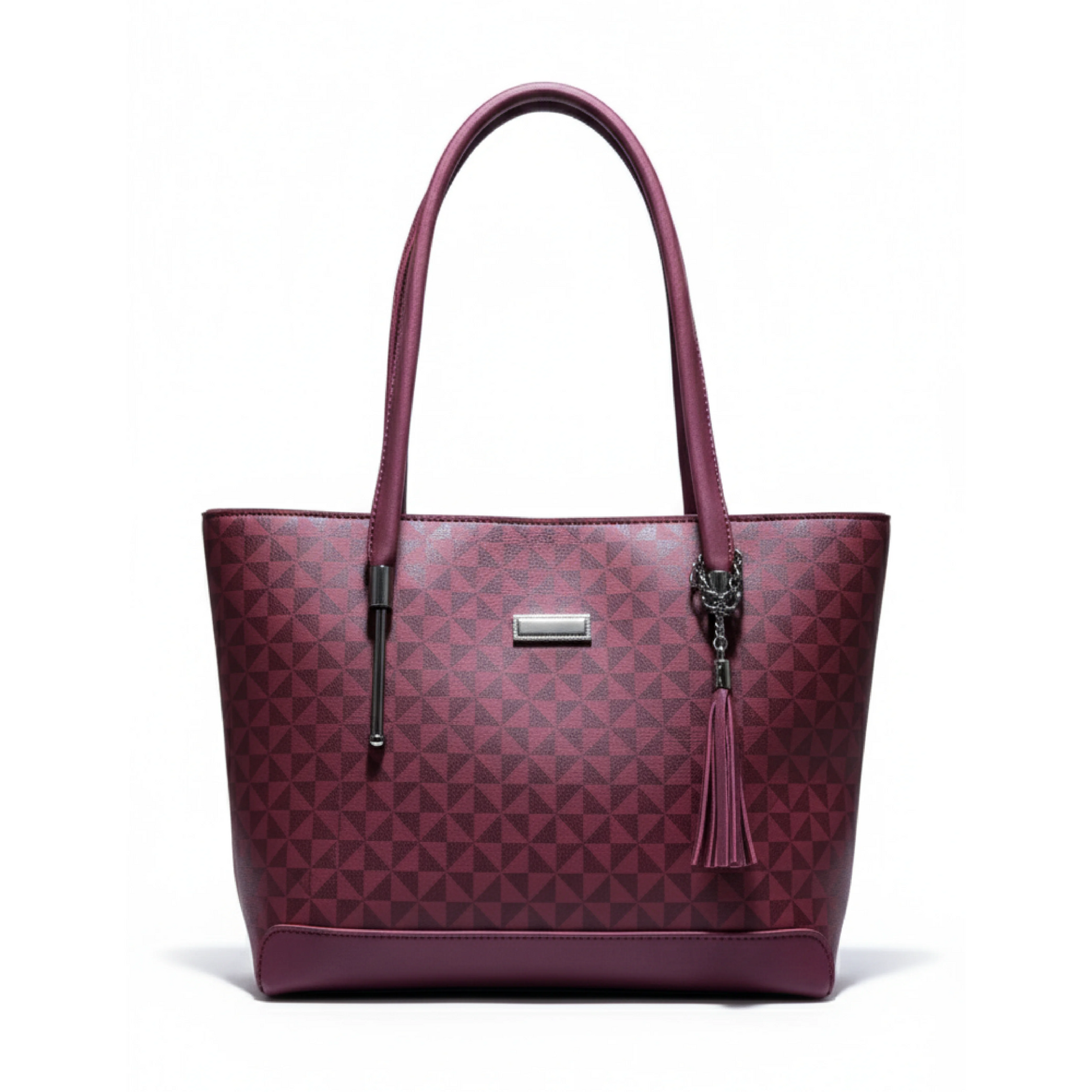 Elevate your everyday look with the Classic a chic blend of style and practicality. Featuring a geometric triangle pattern in soft beige and taupe tones this bag exudes modern sophistication. The textured leather finish and sleek metal accents add a luxurious touch while the detachable tassel charm enhances its trendy appeal.