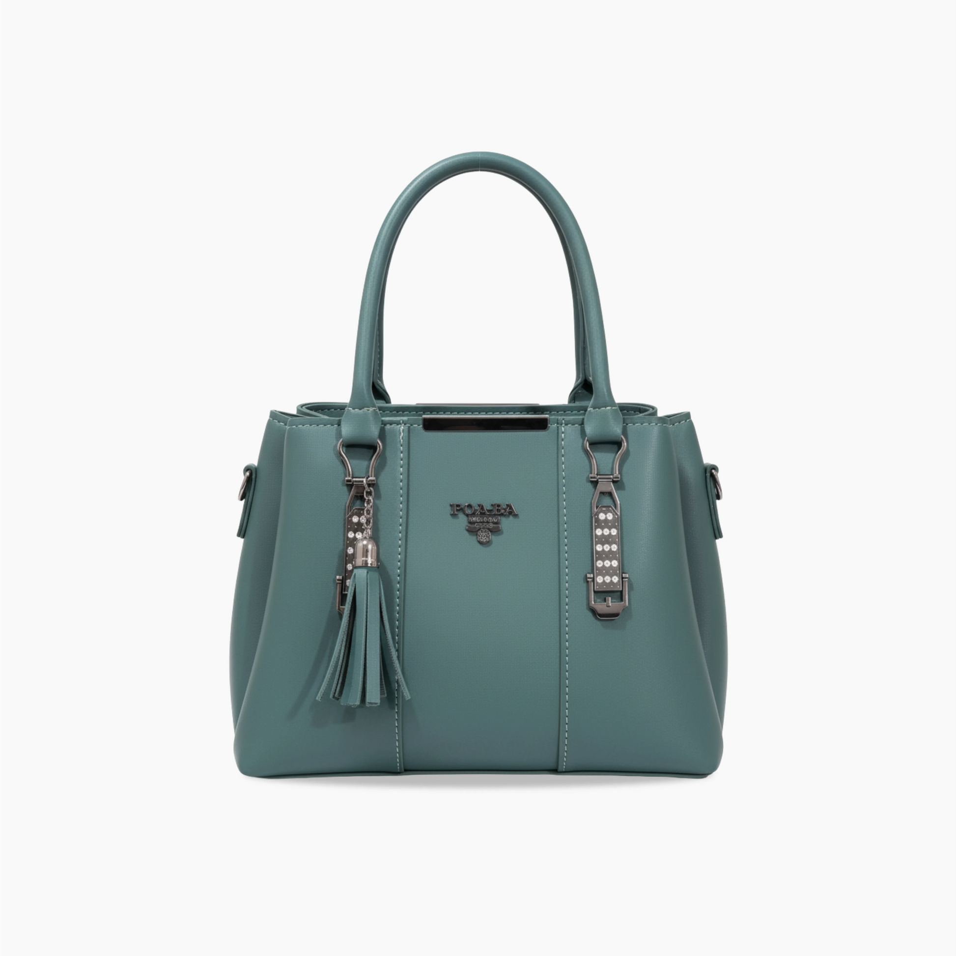 Add a touch of elegance and sophistication to your everyday look with this luxurious teal leather handbag. Featuring sleek, polished hardware and crystal-studded accents, this bag effortlessly combines style with function. The detachable tassel and intricate detailing give it an extra touch of charm, making it the perfect accessory for any occasion.