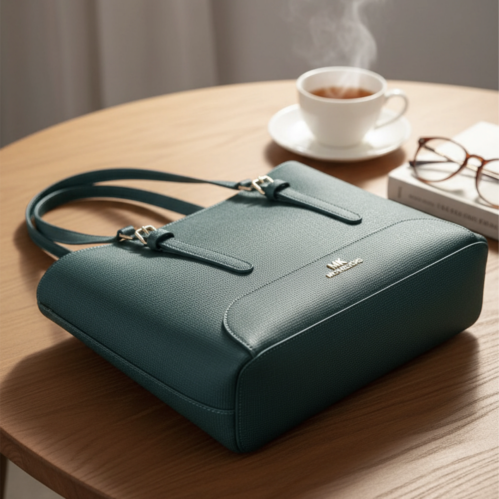 The iconic Signature Gold-Tone is displayed proudly on the front, complemented by luxurious gold-tone hardware on the adjustable strap buckles for a touch of glamour.