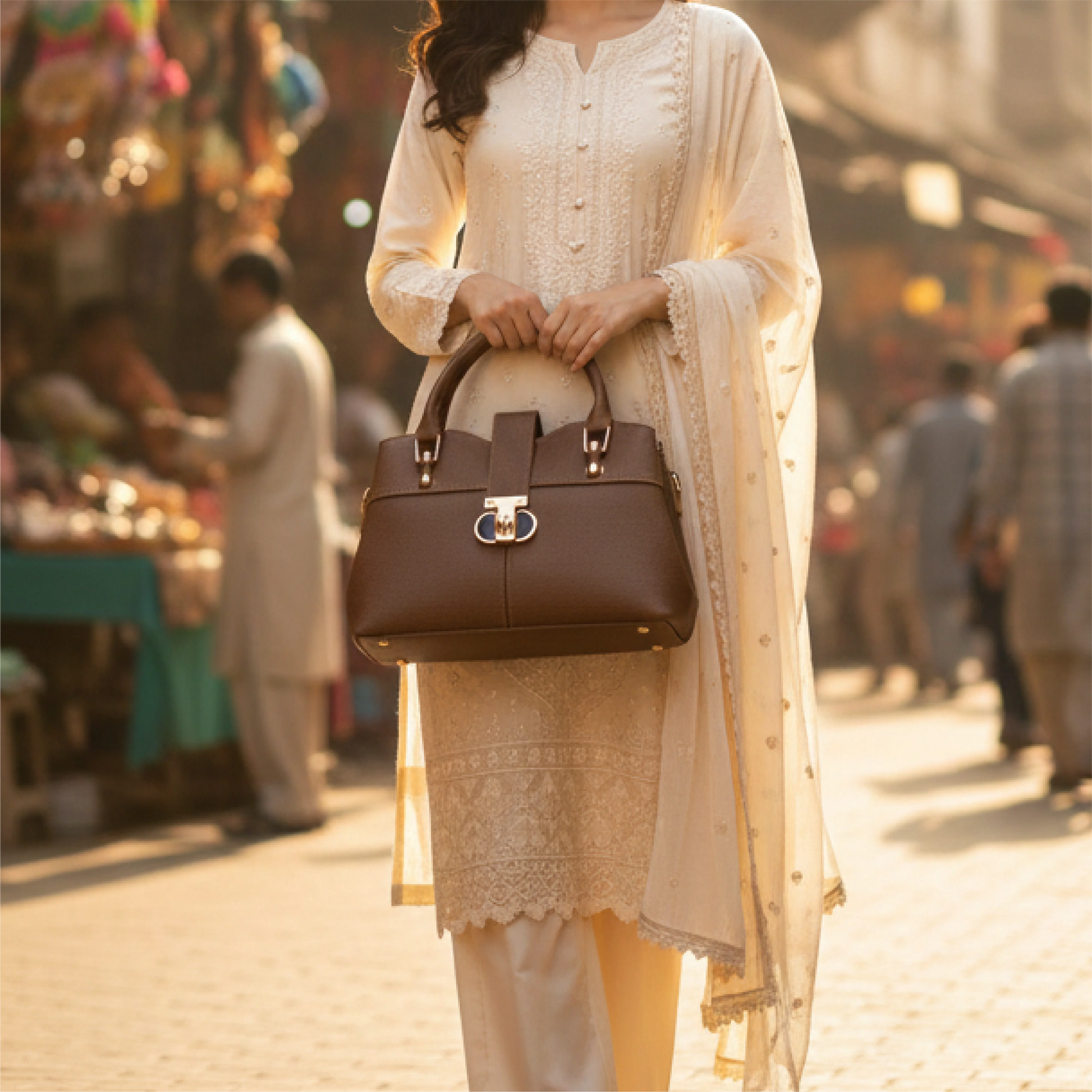 This is a structured brown handbag made from textured (possibly faux or genuine leather) material. It features dual rounded handles on top gold-tone hardware and a front flap strap with a turn-lock clasp that has a stylish black and gold accent. The bag has a classic, elegant silhouette slightly wider at the bottom for stability and space and clean stitching lines that give it a refined premium look.
