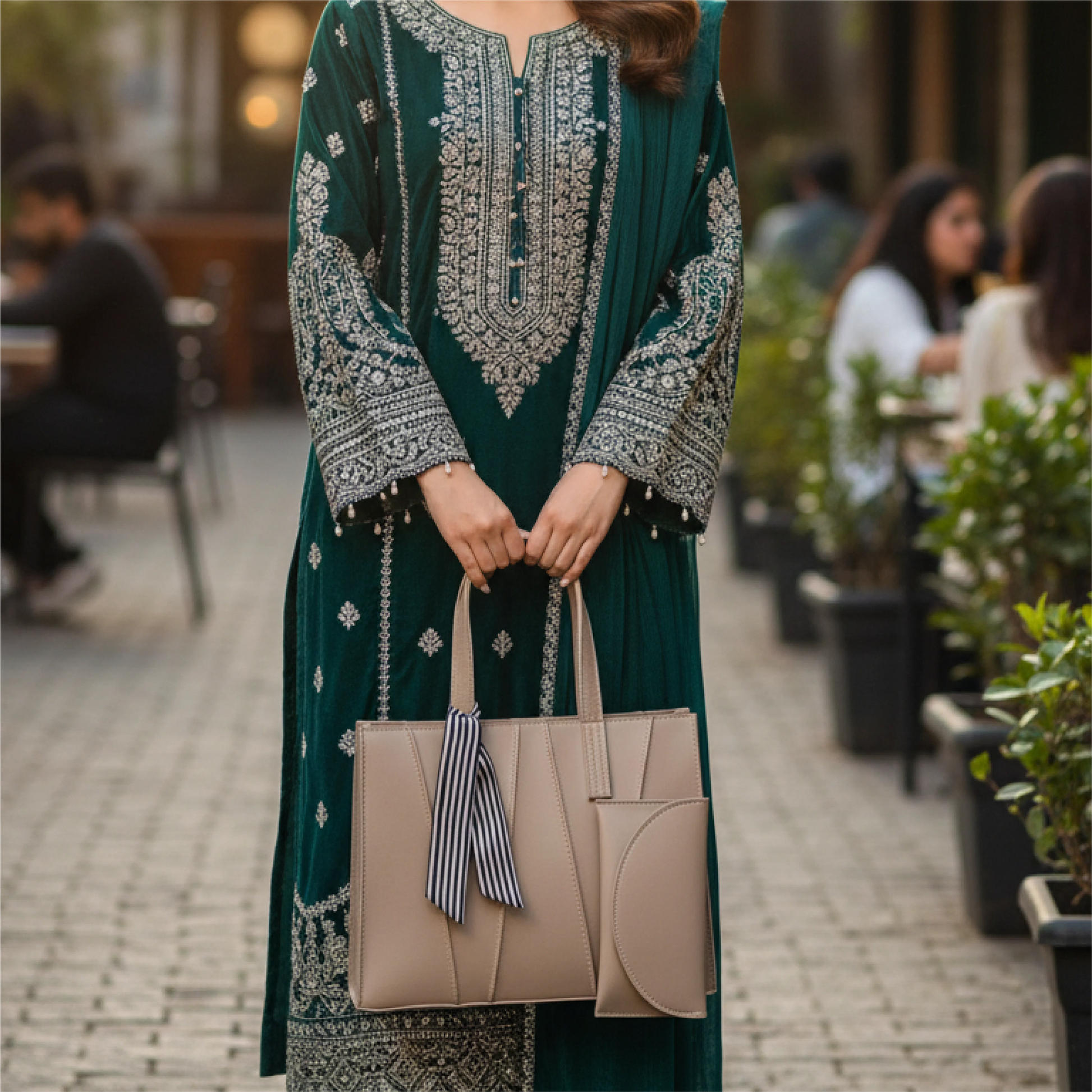 Introducing the perfect blend of modern sophistication and everyday functionality. Our Elegance Handbag is designed for the woman who needs a bag that's as stylish as it is versatile. The deep charcoal gray faux leather is elevated by an architectural pleated paneled design giving this tote a structured high-end look.